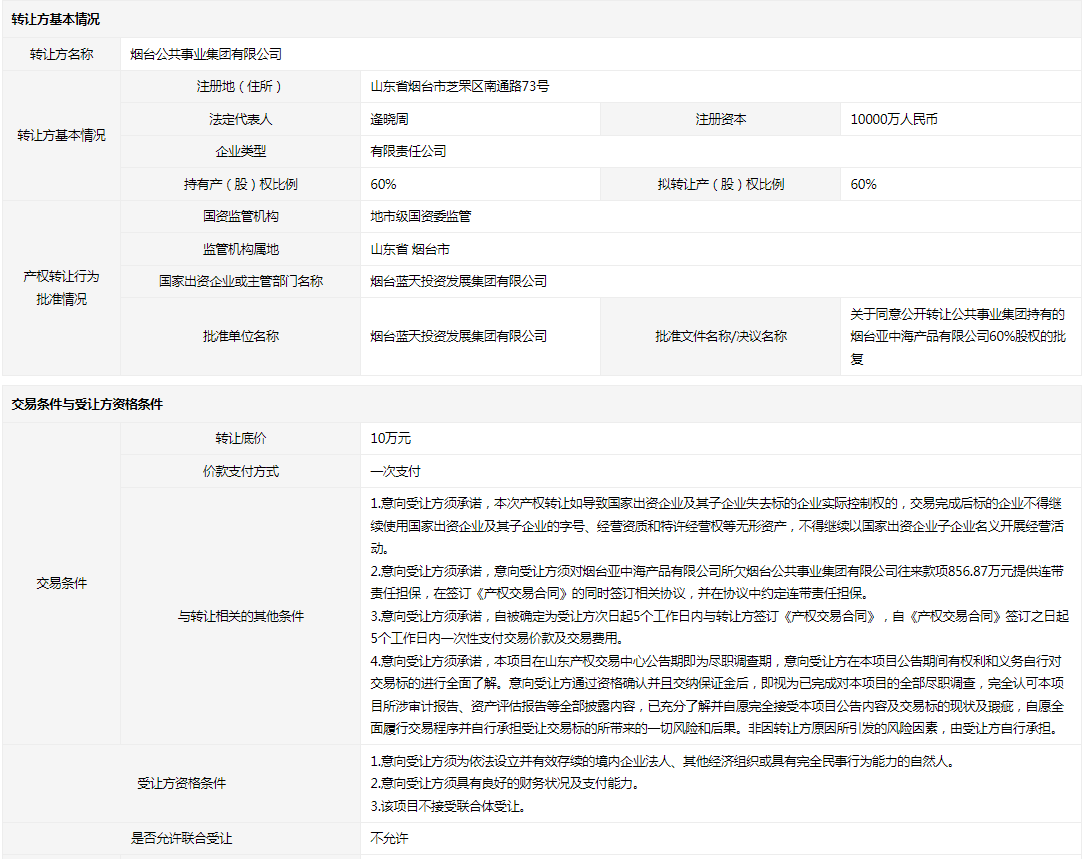 煙臺亞中海產(chǎn)品有限公司60%國有股權