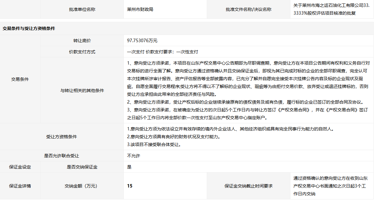 萊州市海之運石油化工有限公司33.3333%國有股權