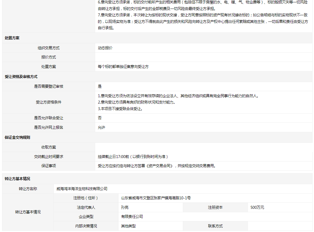 轉(zhuǎn)讓方:威海鴻灃海洋生物科技有限公司